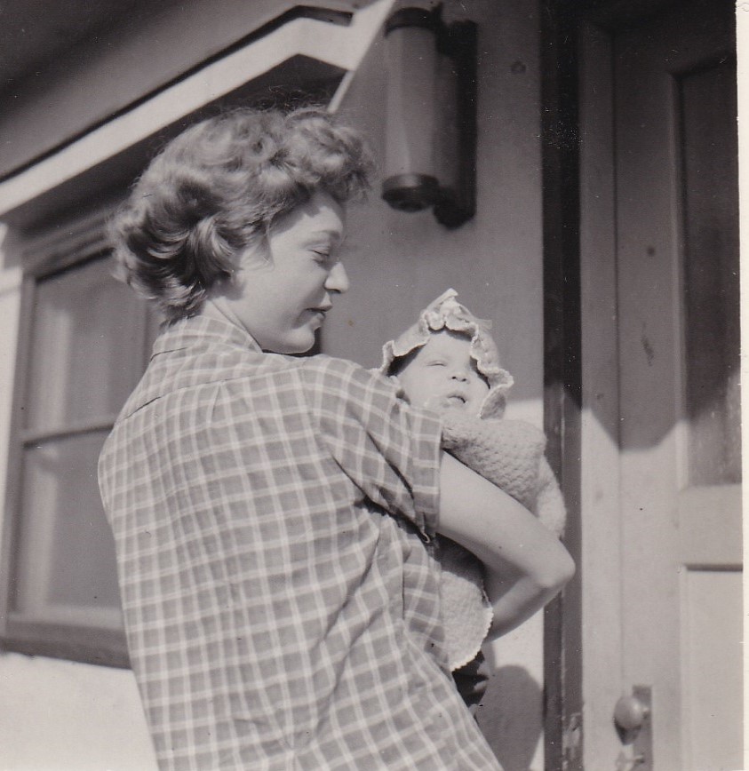Me with Renee in front of our house. She is wearing a crocheted sweater with attached hood my mother made for her