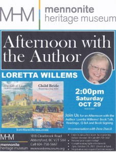 There are many Mennonites in the Abbotsford area, and they have built a beautiful museum to present their story and preserve their history—not just the history of those who settled in British Columbia, but the story of the larger Mennonite world as well. I love visiting MHM. I’m delighted that I’ve been offered the opportunity to present my books there, have my books on its shelves. The story I tell in my books is part of that larger Mennonite story. My family was shaped by it; their lives in turn inform it, add to its substance.